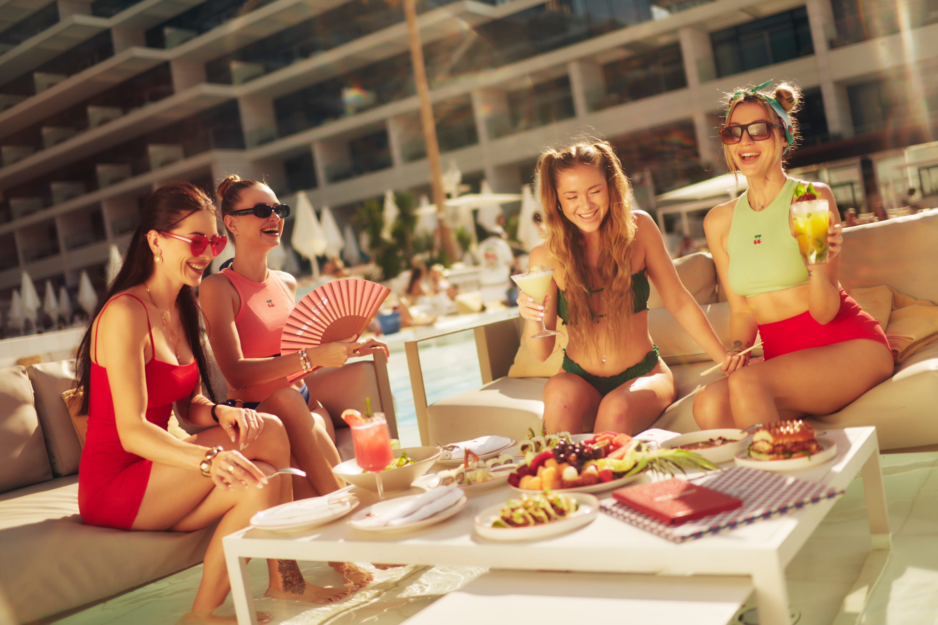 Of course, no beach club experience is complete without exceptional food and drink, and Playa Pacha delivers on both. The menu takes cues from Mediterranean and international influences, offering a selection of light, flavour-driven dishes designed for sharing. Fresh seafood, vibrant salads and elevated poolside bites are complemented by a cocktail menu that leans into both classics and creative signatures. Whether it’s a crisp rosé under the sun or a perfectly mixed cocktail at sunset, every element is designed to enhance the moment.