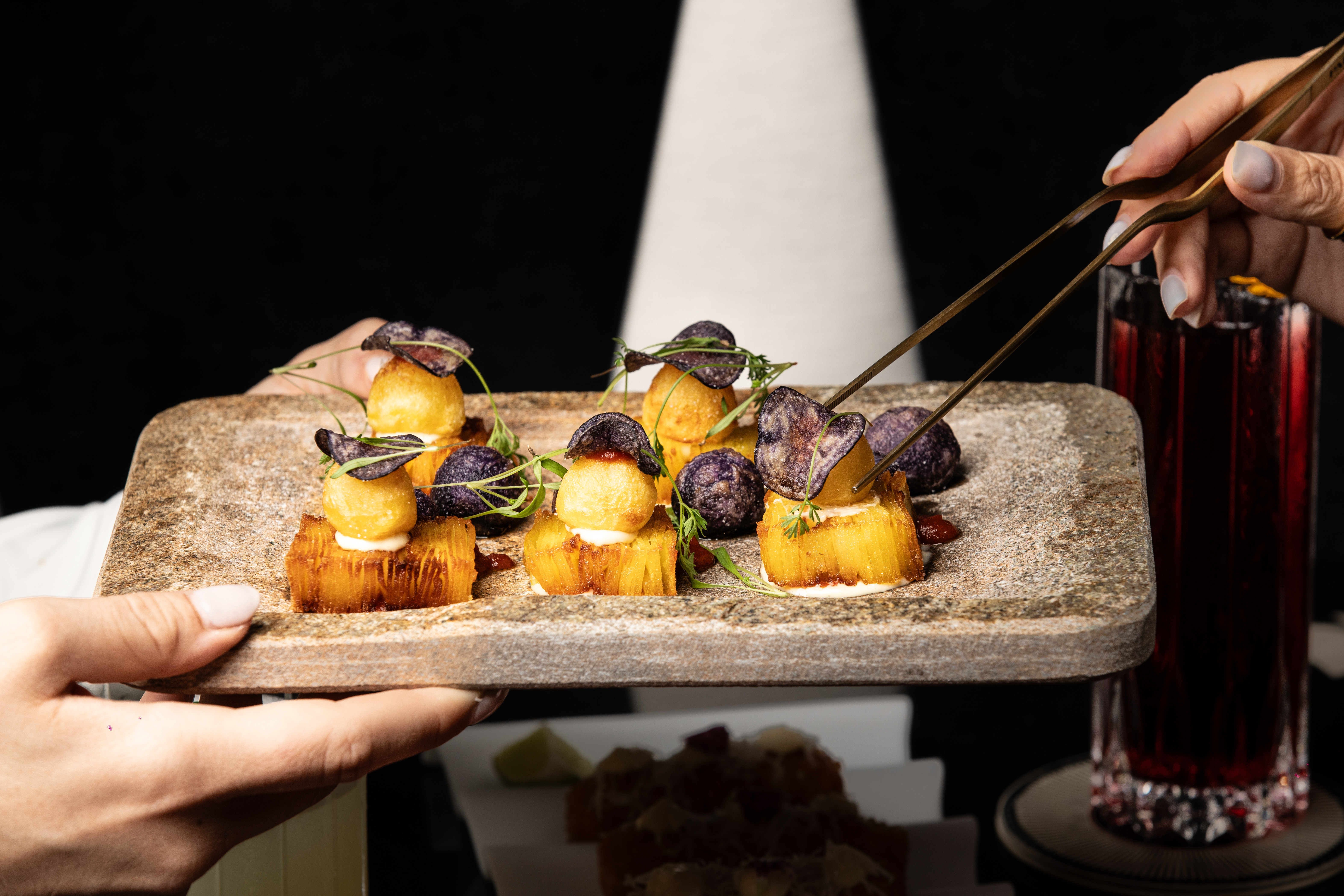 The Wagyu Air Baguette is a bite-sized wonder features cured beef tenderloin so delicate it practically melts in your mouth, topped with smoked cream that adds a silky richness. The olive oil caviar bursts with a subtle flavour, while pickled onion cuts through the creaminess with a tangy punch. It’s an elegant yet playful bite that pairs beautifully with the Magic Wizard bringing a touch of enchantment to your dining experience.